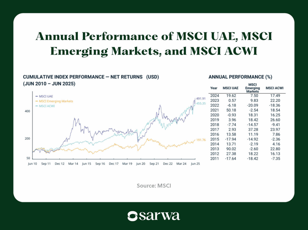Another example of the latter can be seen in its 2025 yield-to-date (YTD). While the S&P 500 Index and the MSCI ACWI Index are up 6.43% and 10.05%, respectively, the MSCI UAE Index is up 20.66%.