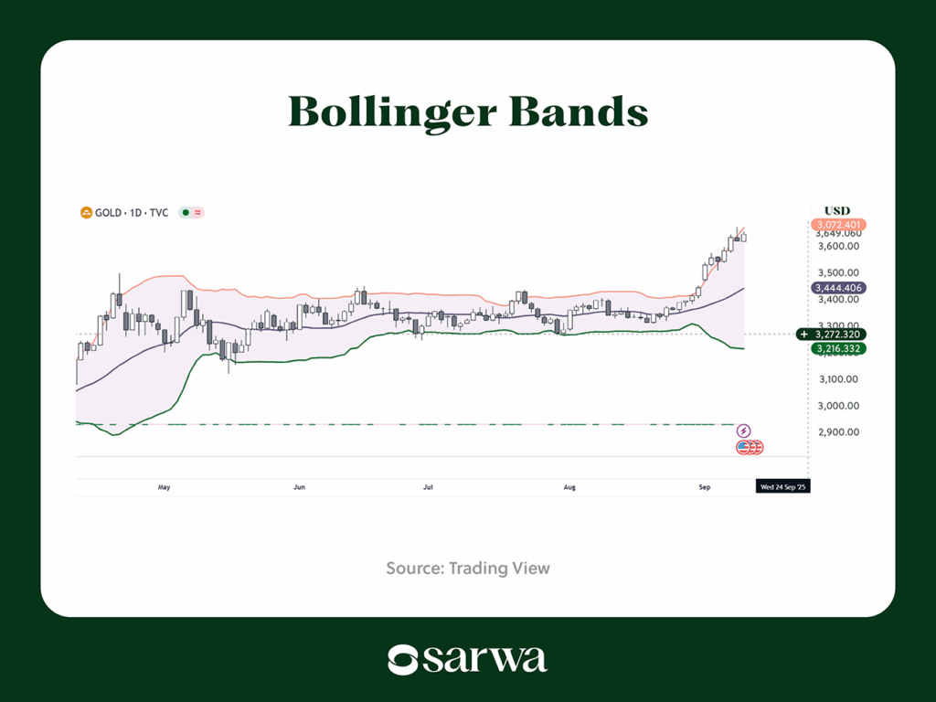 Some will buy gold at the lower band and sell gold at the upper band (and vice versa). Those with lower risk tolerance will buy once the price crosses the middle band and sell at the upper band (and vice versa).